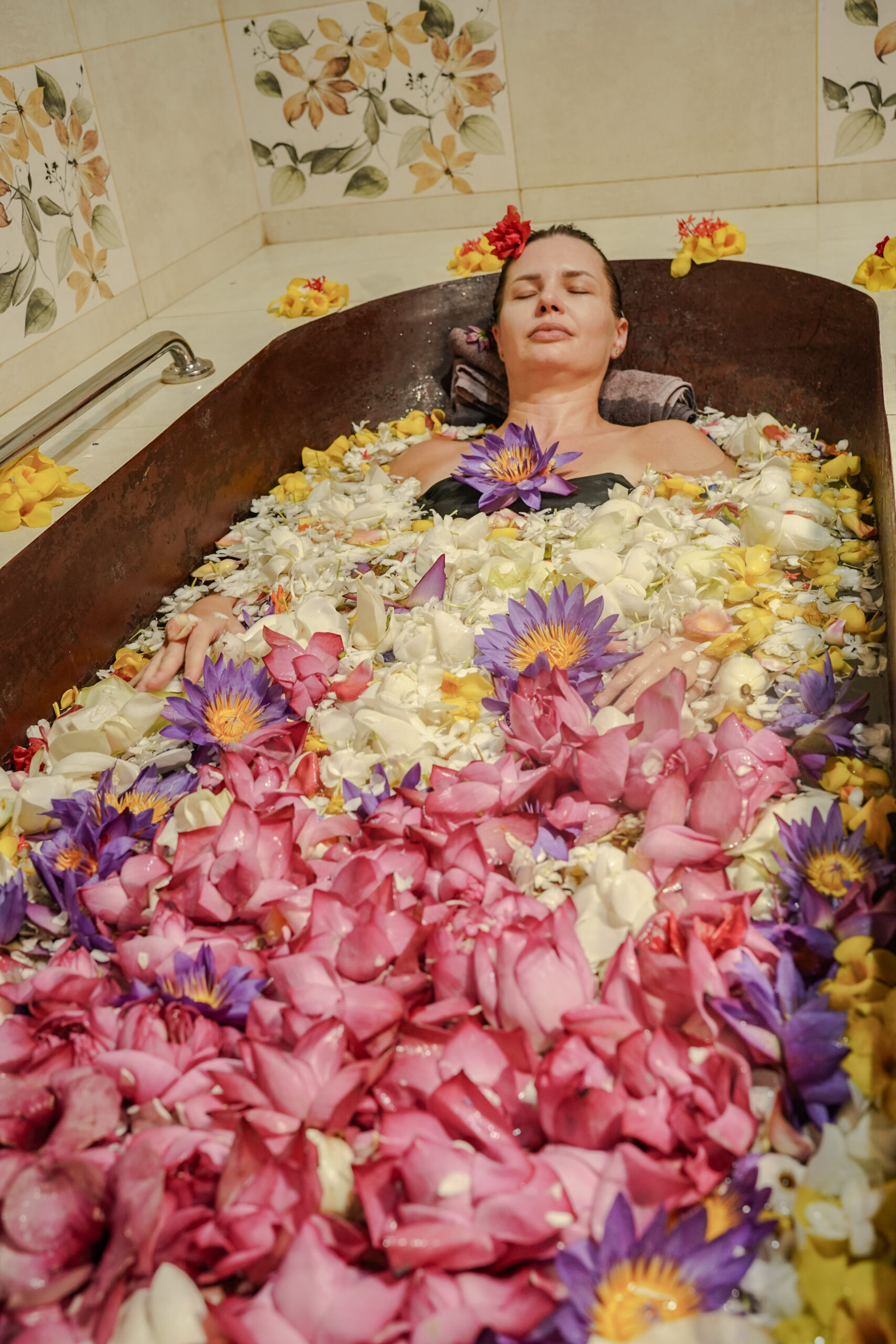 Das Blumenbad ist die Königin der Ayurvedischen Bäder und bildet oft den krönenden Abschluss einer erfolgreichen Ayurveda-Kur. Es kann aber auch als Wellness-Behandlung genommen werden. Unzählige heimische, verschiedene Blüten werden unmittelbar vor der Anwendung gepflückt und dem lauwarmen, fast kalten Bad zugesetzt. Es dient dazu, die Poren der Haut zu schließen und dem Körper zu helfen. Die Blütenessenzen strömen in das Badewasser und verwöhnen mit diversen unbekannten Düften den Badenden.